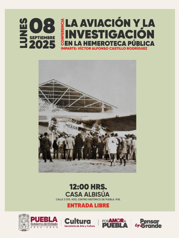 El ciclo de actividades iniciará este lunes 08 con la conferencia “La aviación y la investigación en la Hemeroteca Pública”, a cargo de Víctor Alfonso Castillo Rodríguez. Posteriormente, se presentarán las ponencias “Páginas olvidadas del béisbol profesional en Puebla” (jueves 11), “La importancia de la Hemeroteca Pública ‘Juan N. Troncoso’ en las investigaciones locales” (lunes 22), “La importancia de la Hemeroteca Pública” (miércoles 24) y “Las experiencias en la Hemeroteca Pública” (jueves 25).
