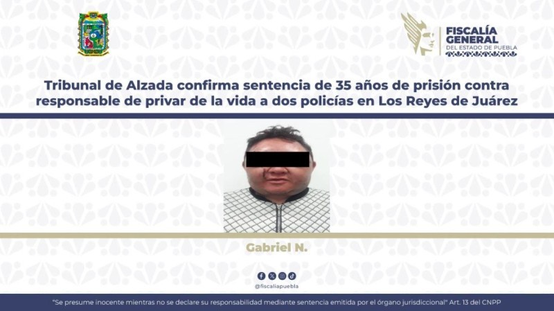 PUEBLA.-Octubre 16 del 2025.-El Tribunal de Alzada confirmó con base en los argumentos presentados por la Fiscalía General del Estado, la sentencia de 35 años de prisión contra Gabriel N., responsable del homicidio de dos elementos de la Policía Municipal de Los Reyes de Juárez, ocurrido el 10 de febrero de 2019.
