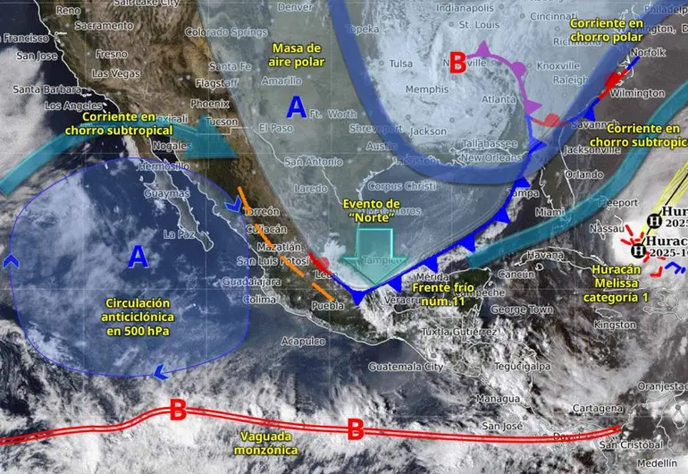 El frente frío número 11 recorrerá el noroeste y norte de la República Mexicana, interaccionará con la corriente en chorro subtropical, originando chubascos y vientos fuertes con rachas de 65 a 80 km/h en Coahuila, Nuevo León y Tamaulipas.