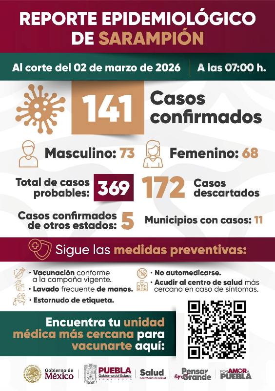 PUEBLA.-Marzo 2 del 2026.-Al corte del 2 de marzo de 2026 a las 07:00 horas, la Secretaría de Salud del…