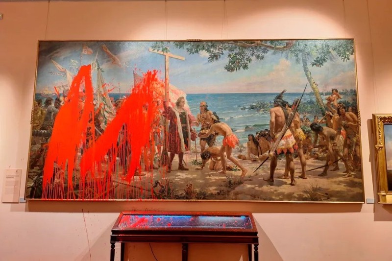 Octubre 12 del 2025.-(EFE).-Dos activistas del movimiento de desobediencia civil Futuro Vegetal lanzaron pintura roja biodegradable sobre un cuadro de…